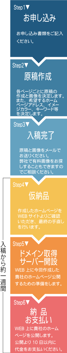 ●制作期間は、原稿と画像の入稿状況やお申込み時の集中具合により変動する場合があります。●代金のお支払いは、WEB公開後、10日以内に指定の口座へお振込ください。●当社では、SEO対策サービスは承っておりません。